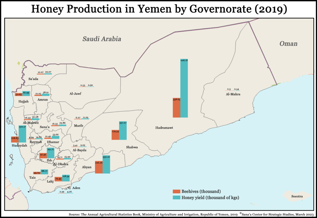 The war has also disrupted beekeeping patterns that are largely intuitive and have contributed to a unique tradition that makes Yemen’s honey trade so distinct. For instance, beekeepers from across Yemen traditionally take their bees to the Tihama region (particularly Hudaydah governorate) once a year so that their bee colonies can feed on Tihama trees, known among beekeepers for their health benefits to bees. Since the battle of Hudaydah in 2018, however, beekeepers have been unable to access these pastures, in part due to the proliferation of landmines. “It’s like having a kid that grows up without protein,”[34] said a beekeeper from Wessab, on what this means for the larger health and life of Yemeni honey bees without access to Tihama’s bee pastures, as these pastures are rich in pollen necessary for the reproduction of bees.